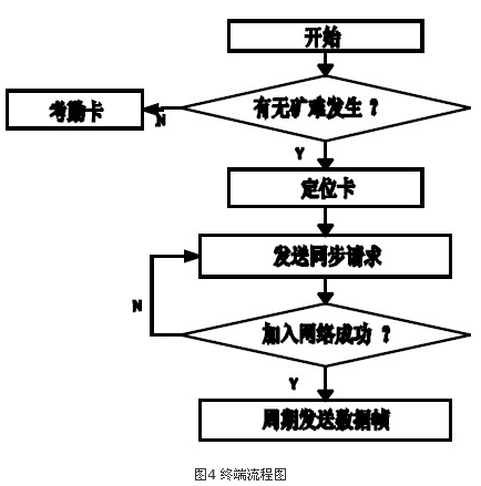 Wireless searcher system consists of wireless searcher and personnel terminal RF card two, terminal wireless searcher as network coordinator, responsible for the establishment of a beacon enabled network, allowing a join request terminal RF card added to the network, when added after the success, can carry out data transfer, the software flow chart is shown in figure 3. The terminal RF card is used as an examination card in the absence of disaster, when the disaster occurs as a location card, the process is shown in Figure 4.