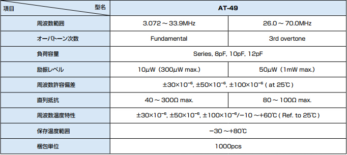 产品特征:周波数稳定性出色的,微处理器等基准时钟用振动子。AT - 49映像用可以
