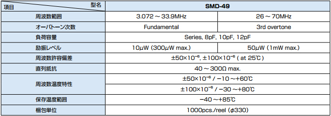 产品特征:49SMD型水晶振动子表面安装化,根据金属包装完全密封,高可靠性,自动封装、回流焊接对应。